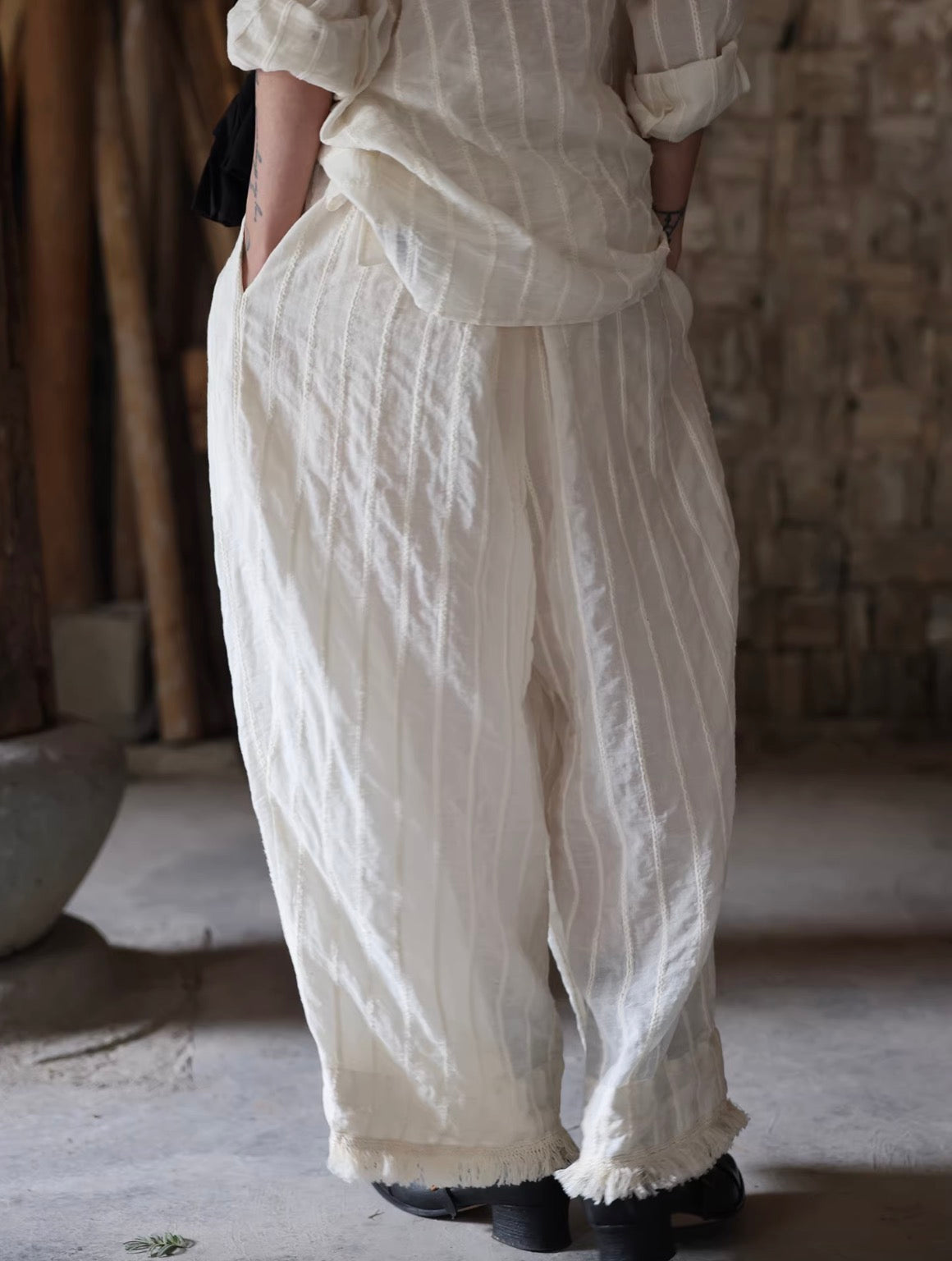 Beige Striped Fringe Wide-Leg Cuffed Pants